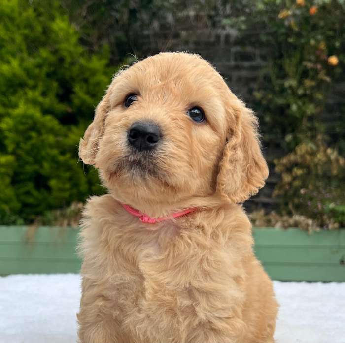 Generally a F1 labradoodle which is a first cross between a Labrador and a poodle has a semi moulting shaggy coat. This coat does lose some hair and has a wiry almost double coated texture. It has a soft down coat with longer wiry hairs. This coat can take 6 to 8 months to develop. As pups they can have quite short coats with just the start of their longer hairs. They also tend to be the biggest of the crosses as half Labrador with the most common cross being with a standard poodle. We do also breed miniature poodle F1s. This produces a smaller first cross. For an F1 coat maintenance is less they generally just need a tidy a few times a year and do not require as much brushing.